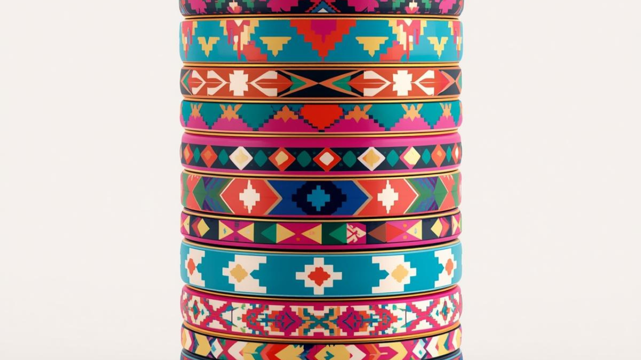 Pattern: Each bangle features intricate, geometric patterns that appear to be inspired by Aztec or Southwestern style designs.
